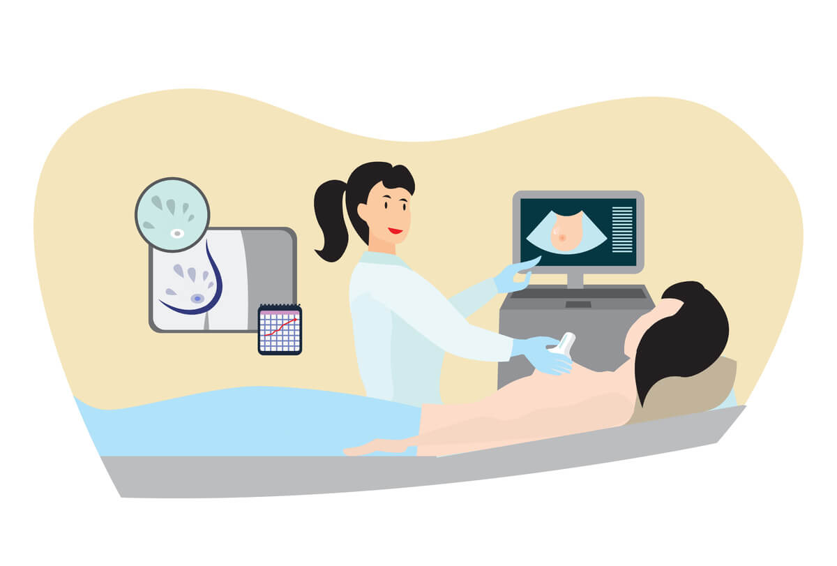 乳房超音波(エコー)検査は、専用のプローブを乳房やわきに当て、超音波の反射を画像として映し出す方法です。エコーでは乳腺とがんの映り方が異なるため、デンスブレストでも病変を見つけやすいとされています。マンモグラフィとエコーを併用することで、乳がんの検出率が高まることが期待されています。